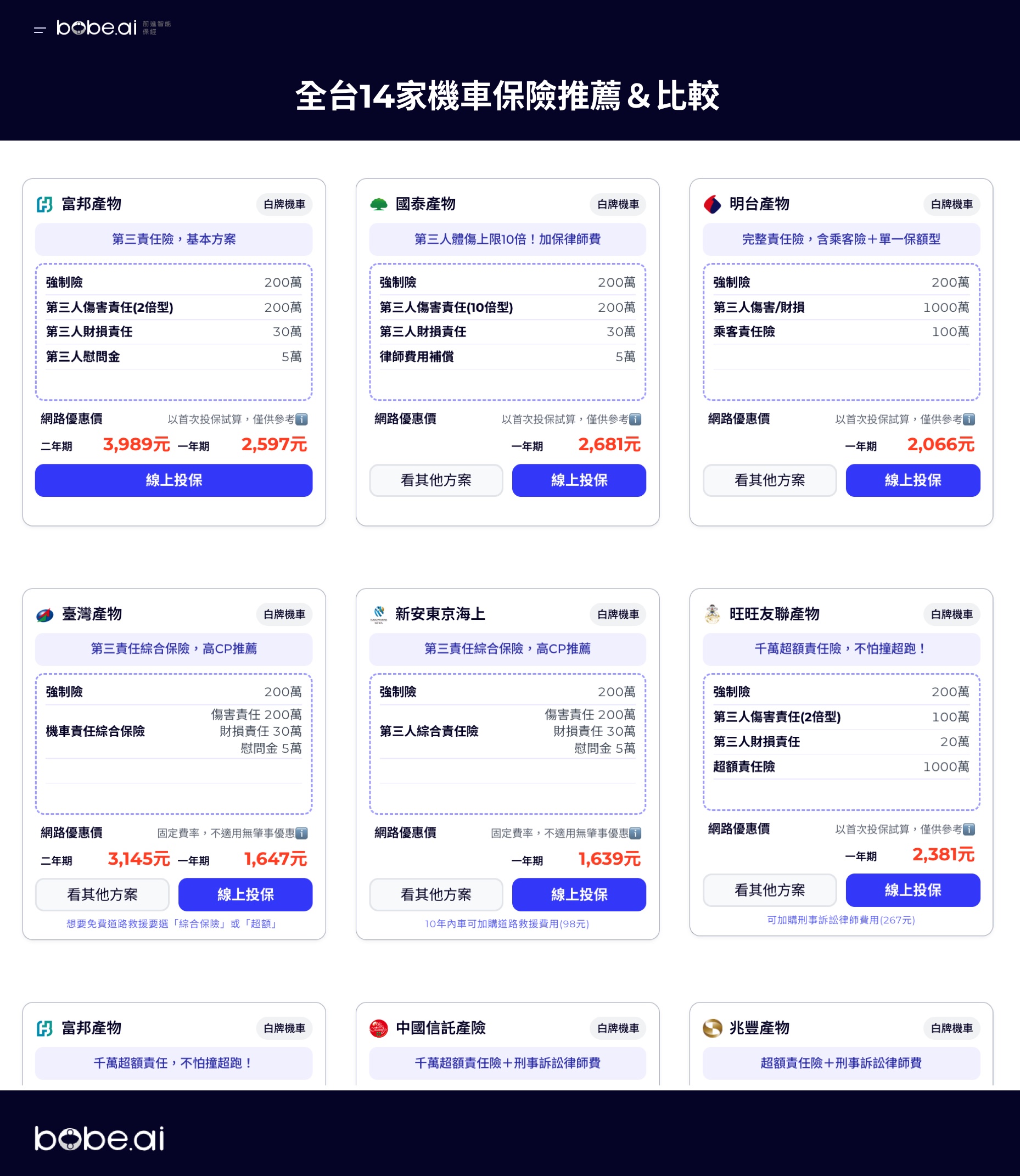 | 富邦產物 | $1,844 | $967 | 投保去 | 看其他方案 |