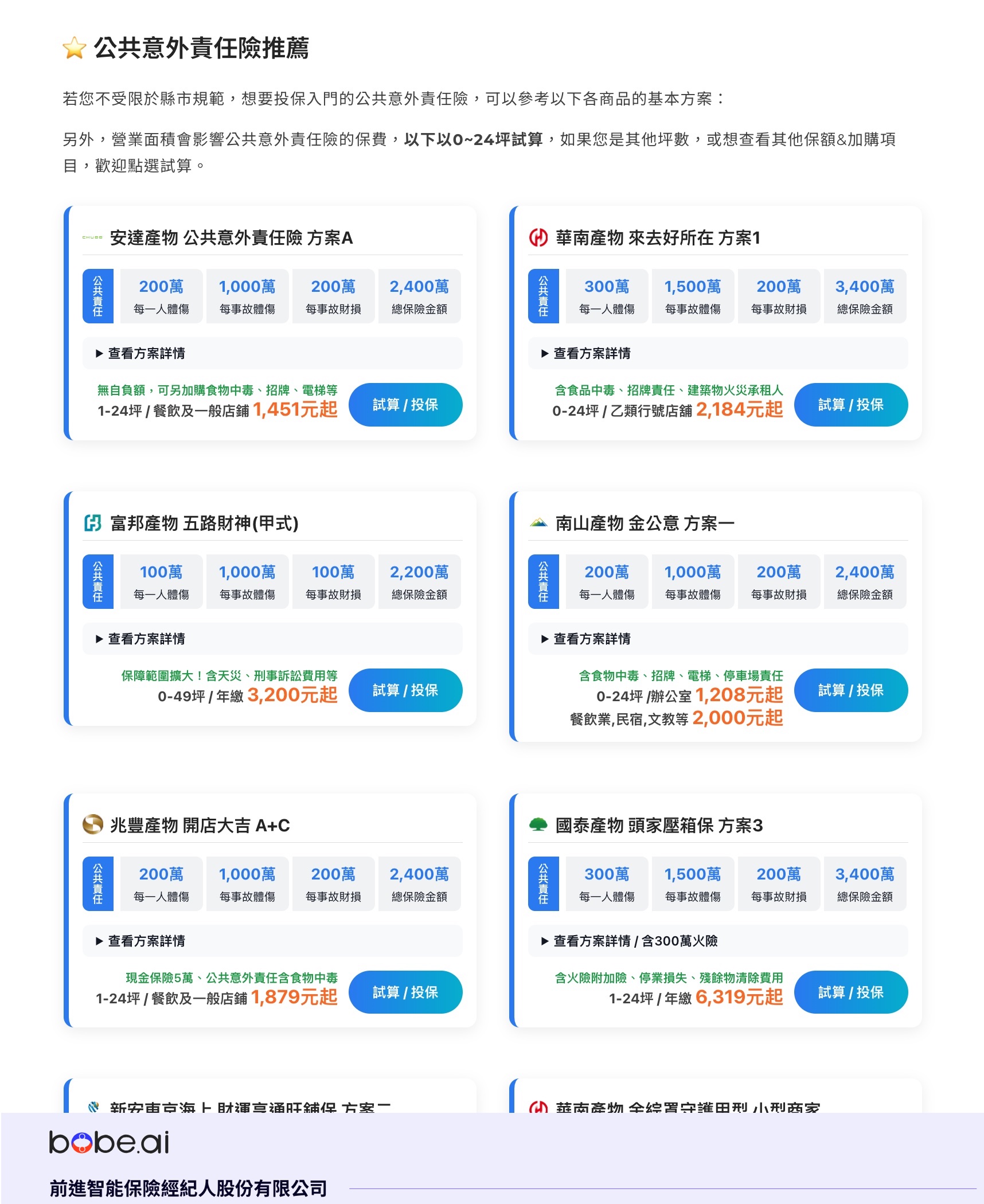 另外,營業面積會影響公共意外責任險的保費,以下以0~24坪試算,如果您是其他坪數,或想查看其他保額&加購項目,歡迎點選試算。
