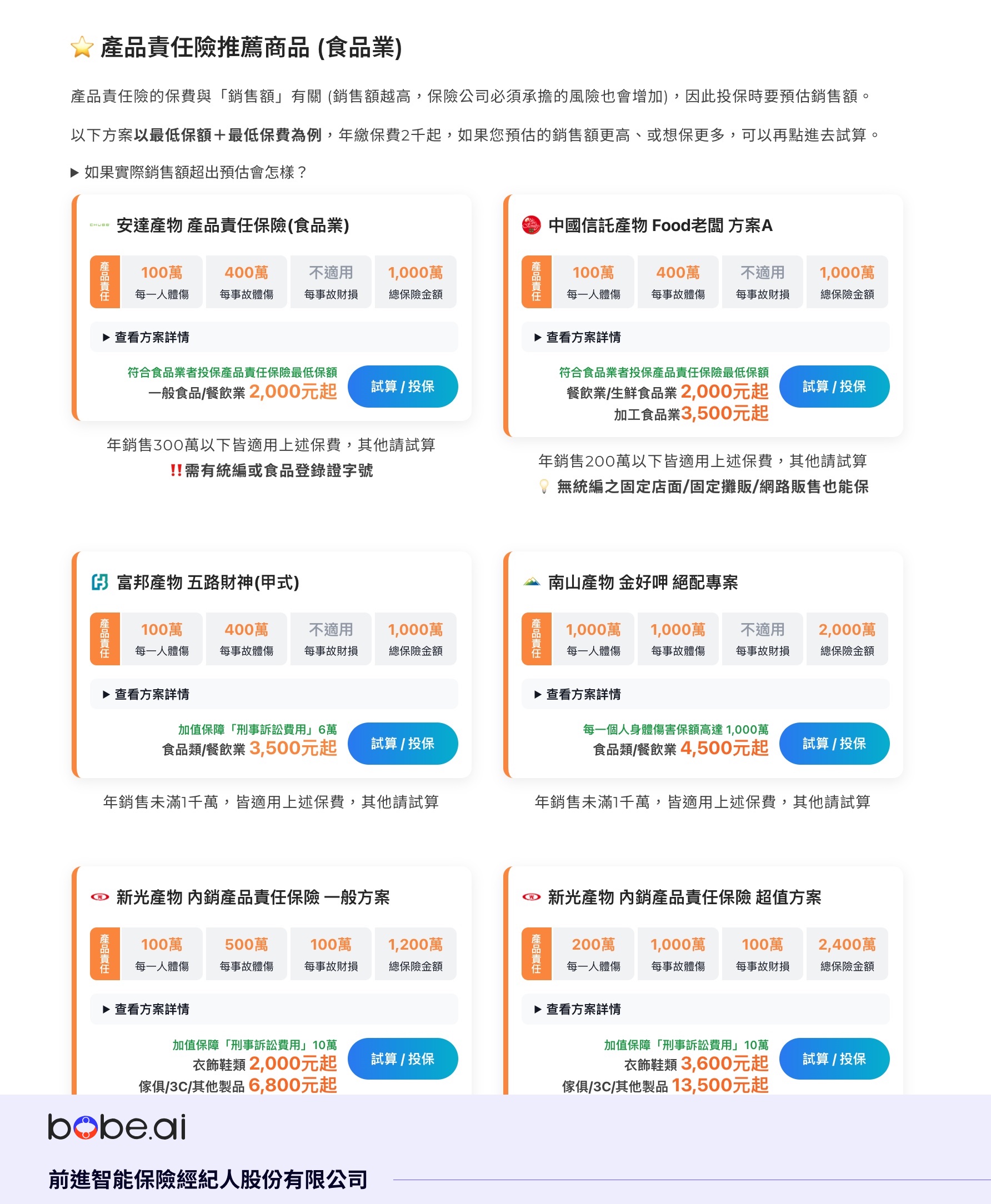 以下方案以最低保額+最低保費為例,年繳保費2千起,如果您預估的銷售額更高、或想保更多,可以再點進去試算。