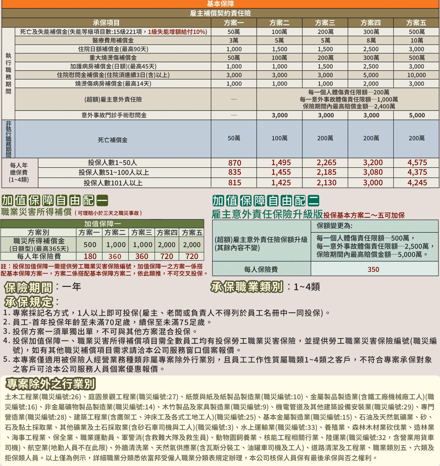 註:本專案不予承保「員工意外事故補償規則」第四條:被保險人依勞工職業災害保險及保護法應負賠償責任而受賠償請求之責任。