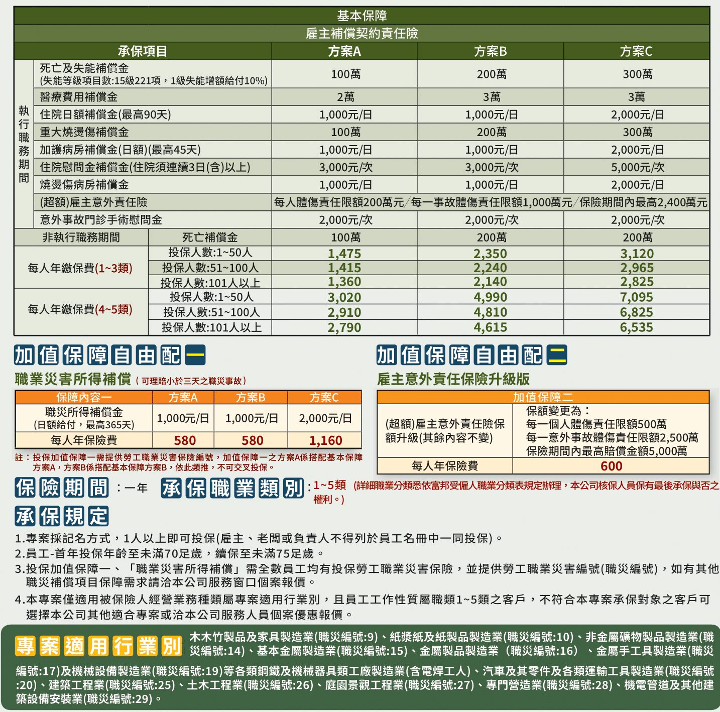- 推薦商品(含團傷):兆豐產物雇主補償契約責任保險、富邦產物好頭家PLUS二代