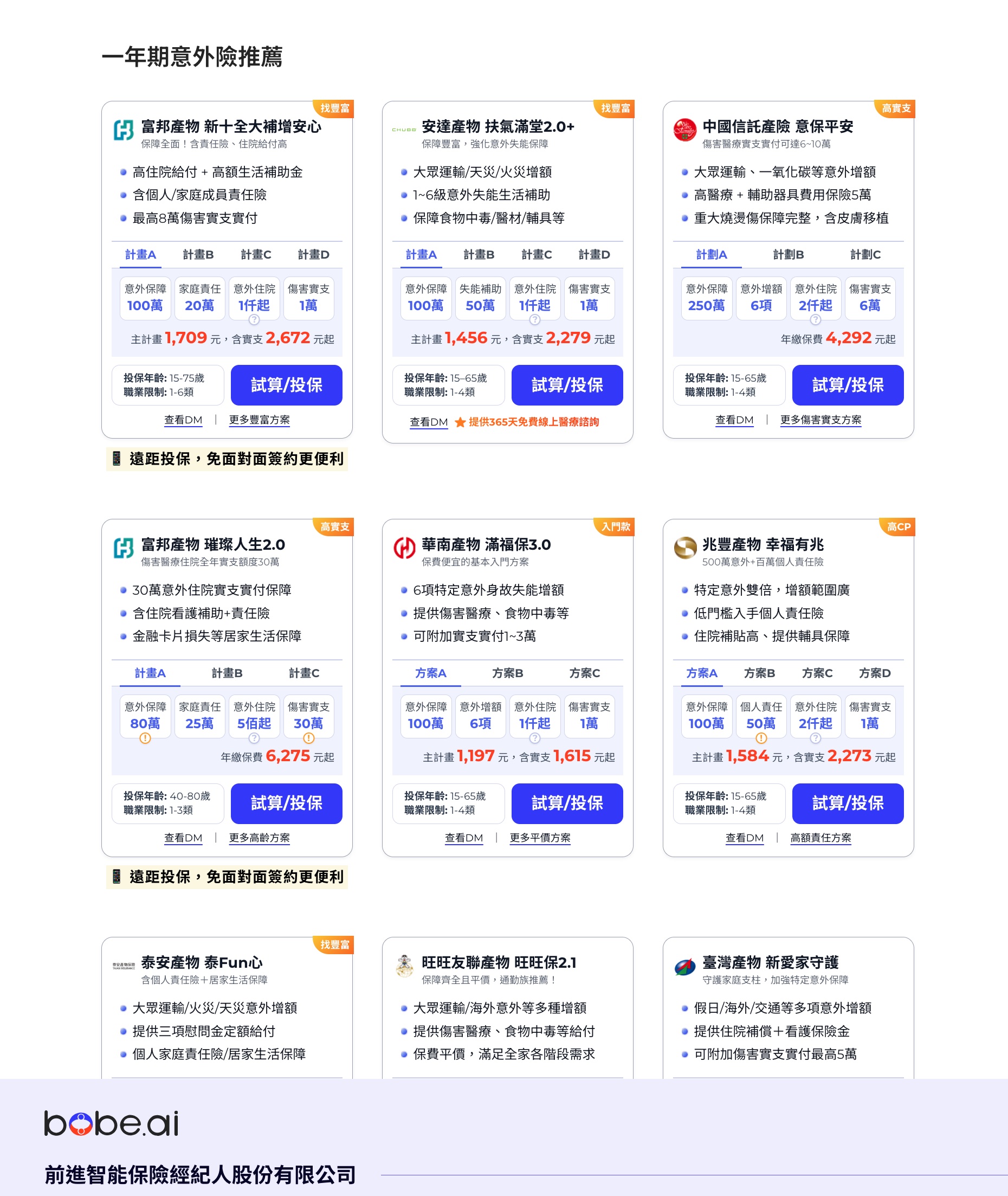 bobe.ai的商品卡提供方案切換功能,您可以逐一查看各方案的保額與費用,找到最符合需求與預算的方案。