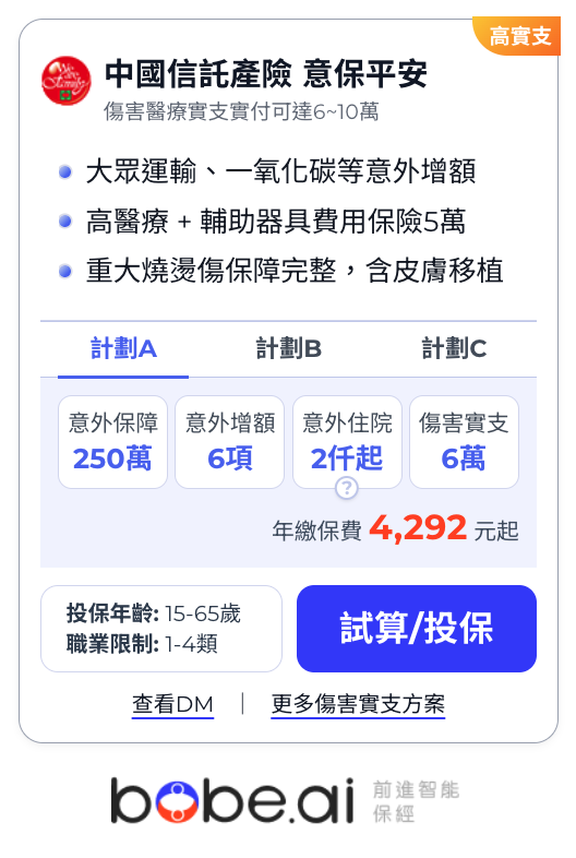 意外核心保障分析 ▶ 傷害實支實付可達6~10萬,適用想一張購足的人!