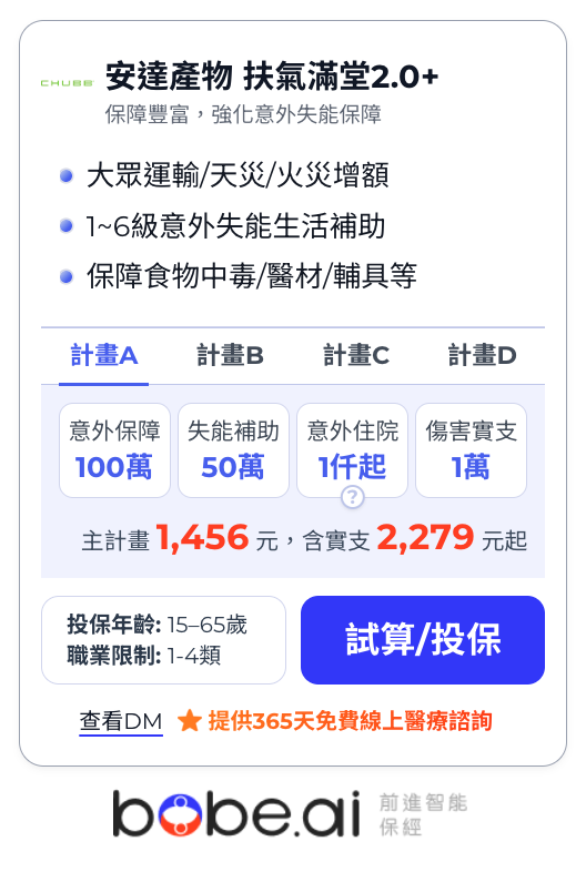 扶氣滿堂2.0+是一張保障豐富的意外險,額外增加一至六級失能生活補助、重大失能住院日額、特定人工器官保險、顏面傷害失能整形費用及輔助器具費用保障項目。