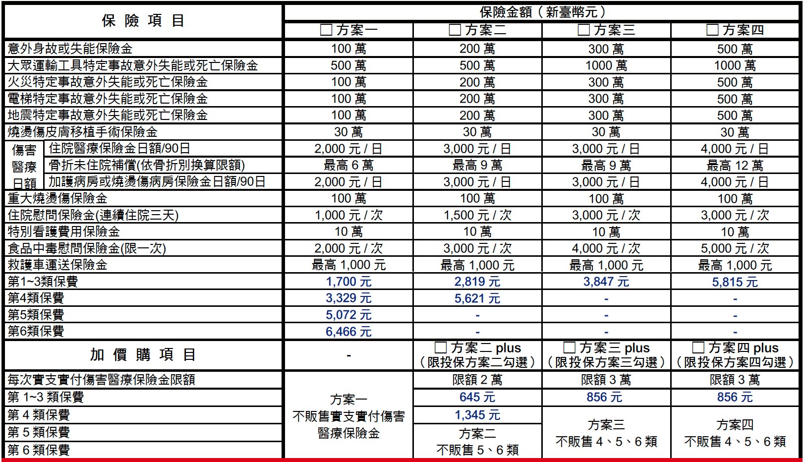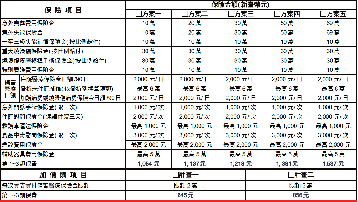 • 意外身故:提供基本保障,可視需求投保10~69萬。