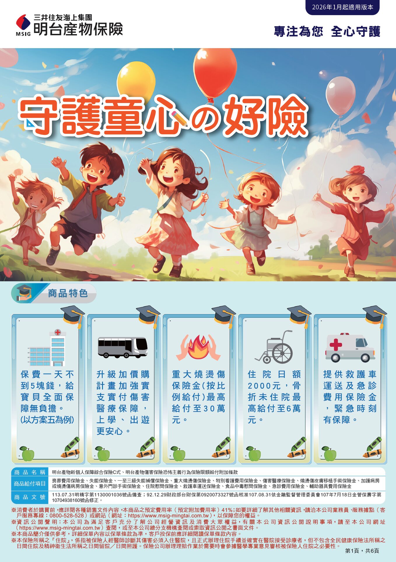 守護童心の好險是兒童專屬方案,提供住院日額、未住院骨折、食物中毒等多項傷害醫療保障。